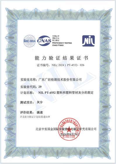 喜報(bào):廣紡檢測公司收到塑料灰分測定能力驗(yàn)證結(jié)果滿意證書